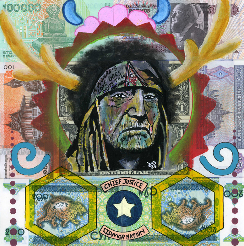 Chief Justice (2023) is an original moneyart by Craig CMOR Morrison and Sidarta for The Great Art Reset, on eight real banknotes from Uzbekistan, Cambodia, Egypt, Myanmar, Croatia, and the United States …