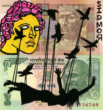 No Fly Zone (2023) is an original moneyart by Craig CMOR Morrison and Sidarta for The Great Art Reset, on real banknotes from India and Ukraine…