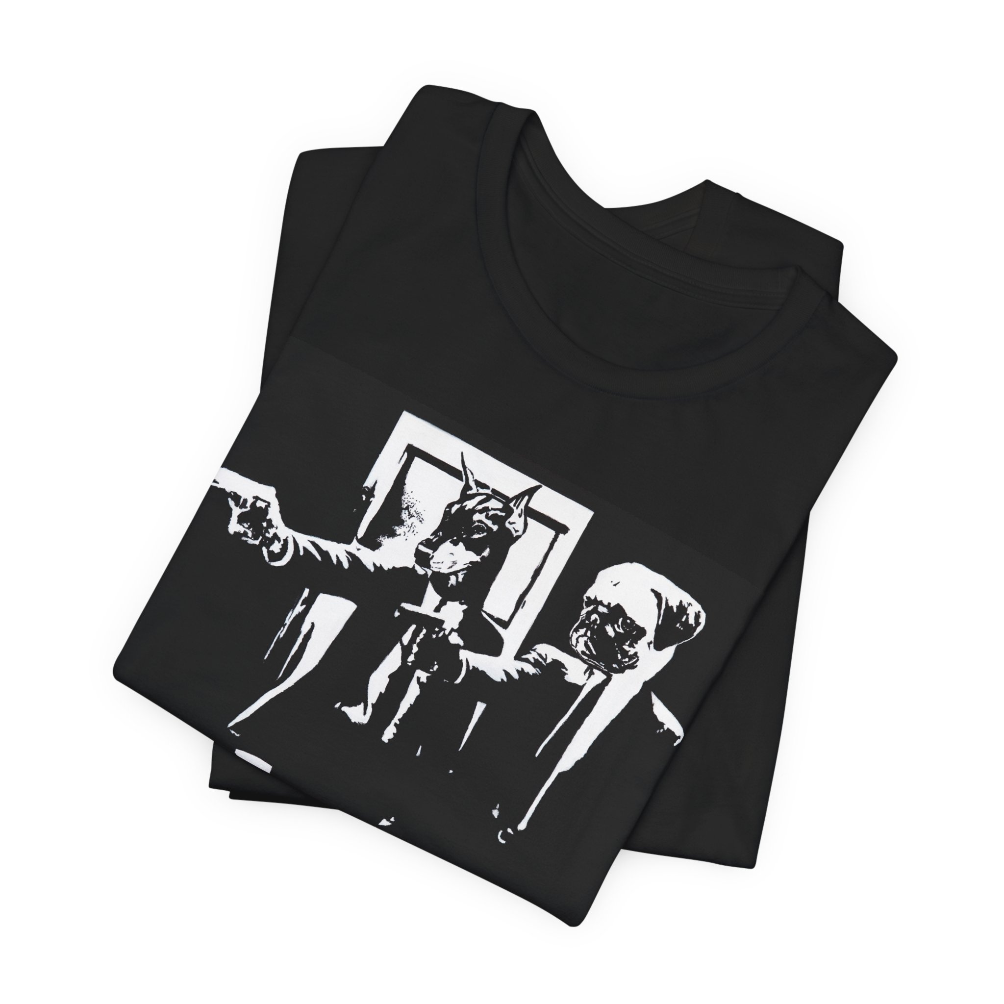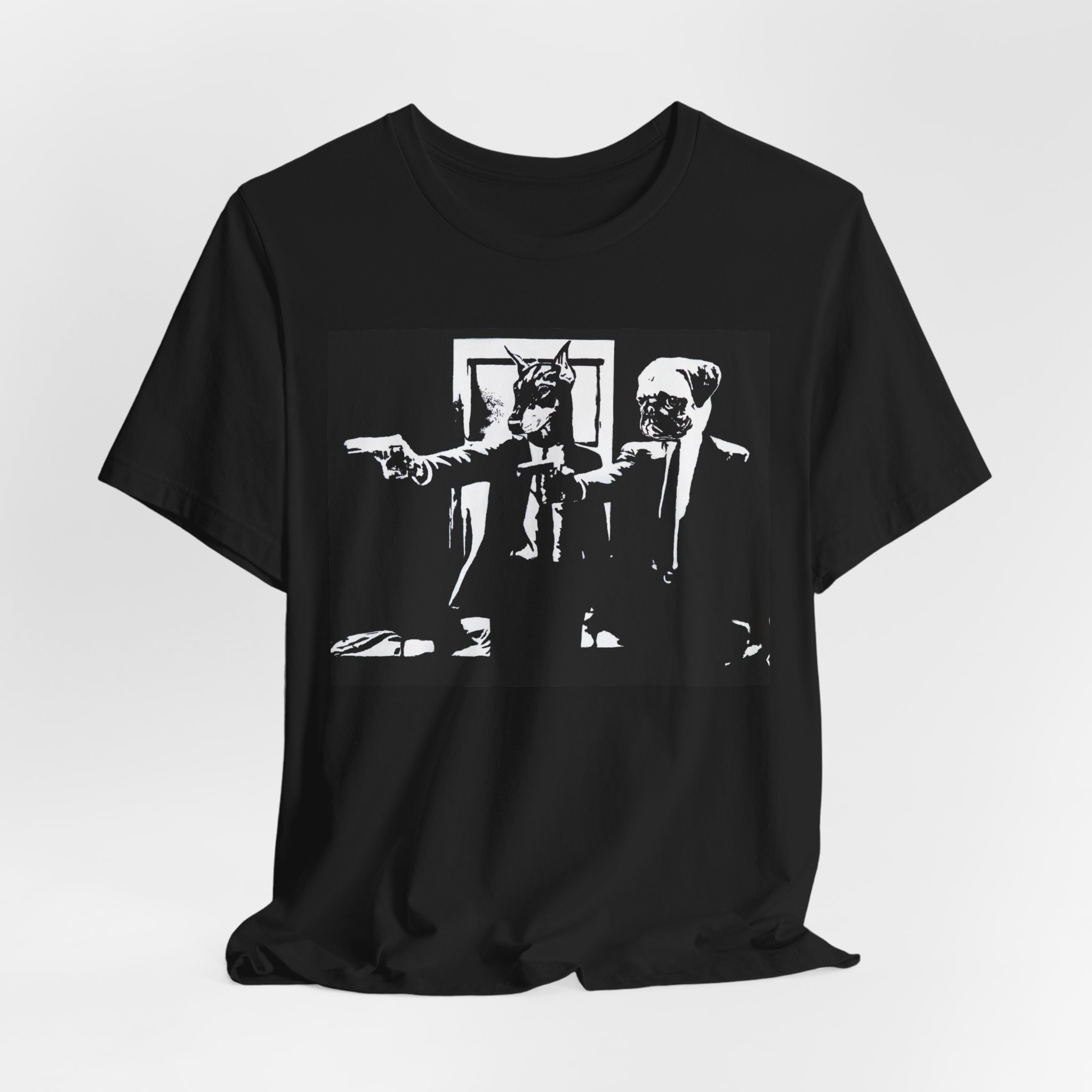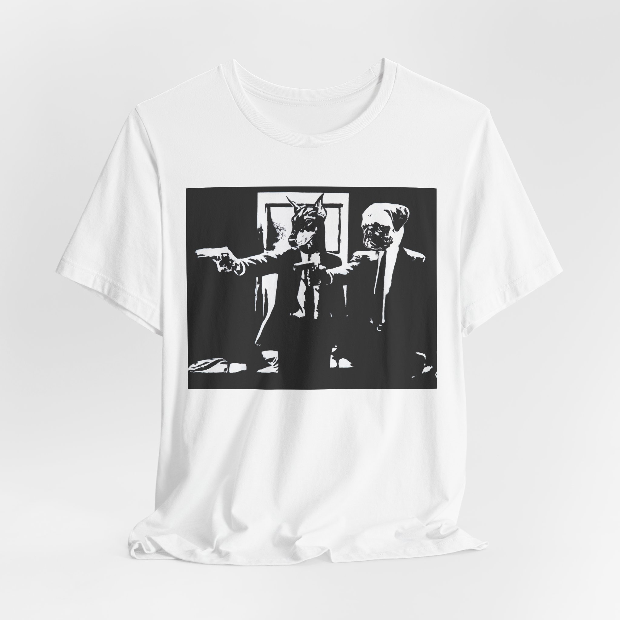 This lightweight jersey tee carries bold, high-contrast artwork across the chest—two suited figures rendered in stark black-and-white for an edgy, cinematic feel. The soft Airlume combed cotton fabric keeps the shirt breathable and easy to wear all day, while the retail fit and classic crew neck give it a clean silhouette that layers neatly under jackets or stands alone. Subtle details like side seams, shoulder tape and a ribbed knit collar keep the tee looking sharp after repeated wear. Wear it to show off a love of retro noir visuals, late-night film conversations, or street-ready graphic style.