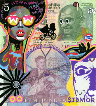 Wildcard (2023) is an original moneyart by Craig CMOR Morrison and Sidarta for The Great Art Reset, on a real banknote from India and a commemorative bill from Sweden…